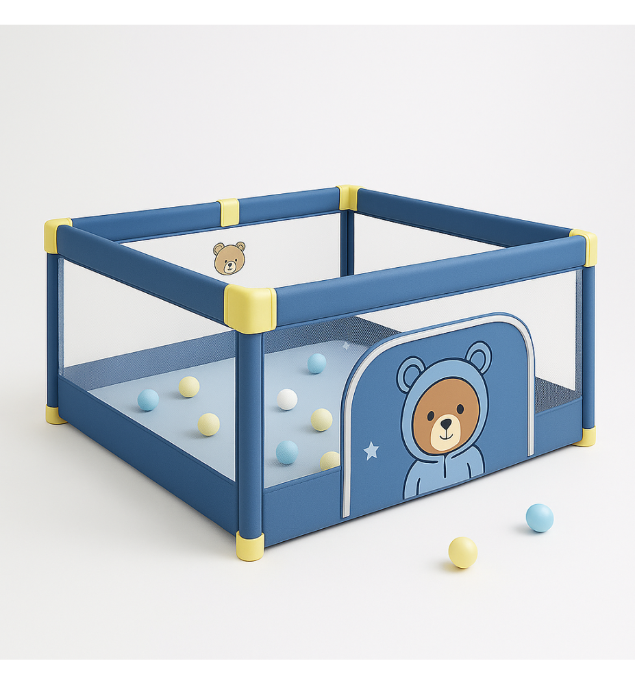 Dječiji sigurnosni ogradni prostor namijenjen je za bezbrižnu igru i sigurno okruženje najmlađih. Izrađen je od čvrstog okvira sa mrežastim stranicama koje omogućavaju prozračnost i preglednost, dok dizajn sa motivom medvjedića unosi veselu atmosferu.