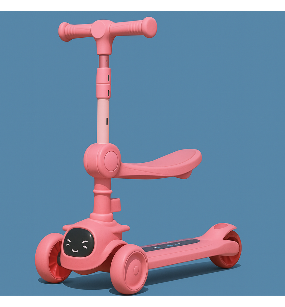 Multifunkcionalni trotinet sa sjedištem, idealan za djecu od 1 do 5 godina. Stabilan, siguran i zabavan, sa simpatičnim nasmijanim licem sprijeda. Savršen za prve vožnje!